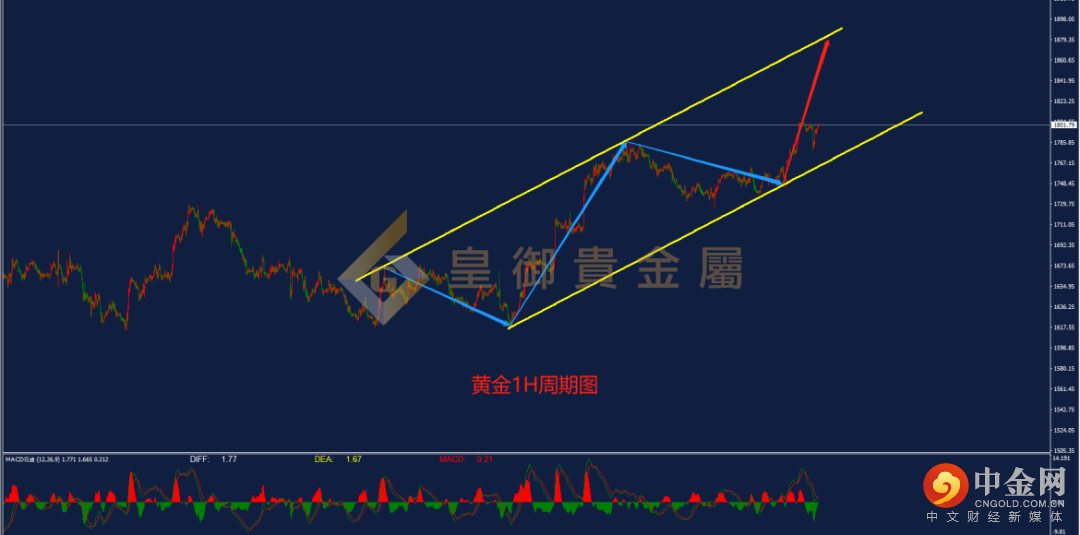 从黄金1小时周期图来看,黄金自此前于1617附近上涨后,走出高低点逐渐上移的上涨趋势,并构建上行通道,行情于通道内震荡上行。上周,黄金再次向下测试通道底部附近支撑后迎来上涨,有再次向通道顶部上攻的趋势。从指标上来看,MACD指标的DIFF与DEA双线有于0轴上方再次金叉的迹象,预计黄金后市大概率将进行延续上涨。日内操作建议以逢低做多为主,当前可于下方关键支撑1795一线进行入场。