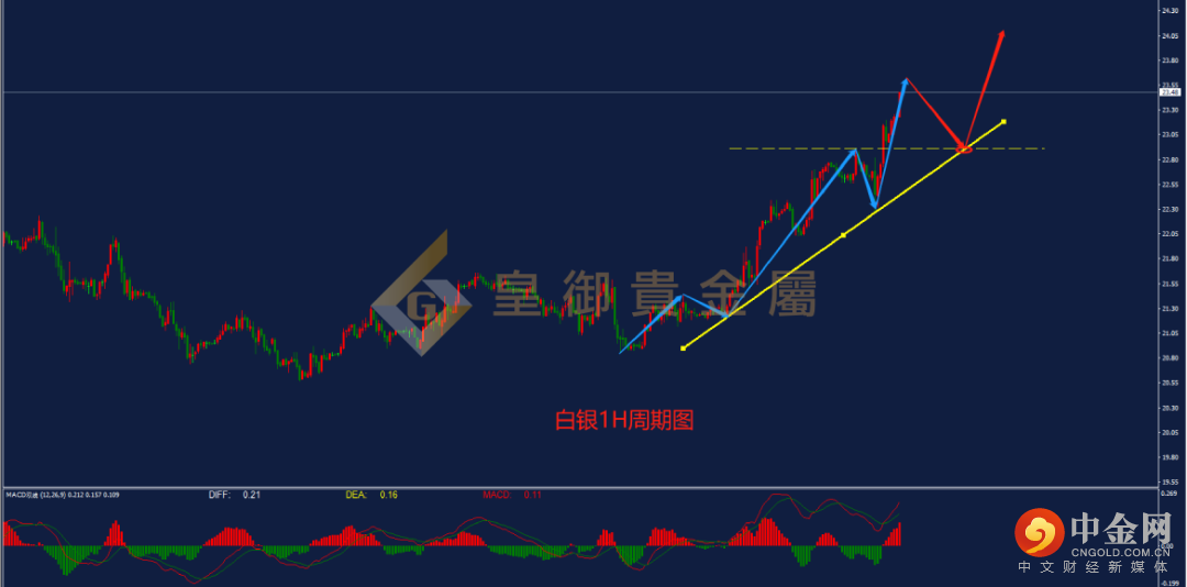 从下方的白银1小时周期图看,白银自此前于低点上涨,走出高低点逐渐上移的上涨形态,并构建上行趋势线,白银于趋势线上方进行震荡上行。上周五晚间,受到数据影响,白银向下测试趋势线支撑后迎来拉升,并突破前高位置22.90一线。从指标上来看,MACD指标的多头动能有放量迹象,且DIFF与DEA双线于0轴上方再次金叉,预计行情后市大概率将延续上涨。日内操作建议以低多为主,可于下方关键支撑22.90一线进行入场。