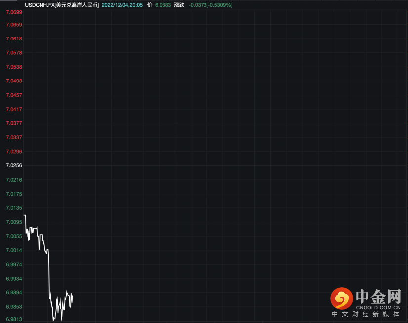 离岸人民币兑美元汇率在12月2日盘中最高报7.0056元,距离破“7”仅一步之遥;两个休市日后,5日早间,该市场汇率“乘胜追击”,最高报6.9813元,收复7元关口。截至9:04,离岸人民币兑美元汇率报6.9888元,较前收盘价涨370个基点。