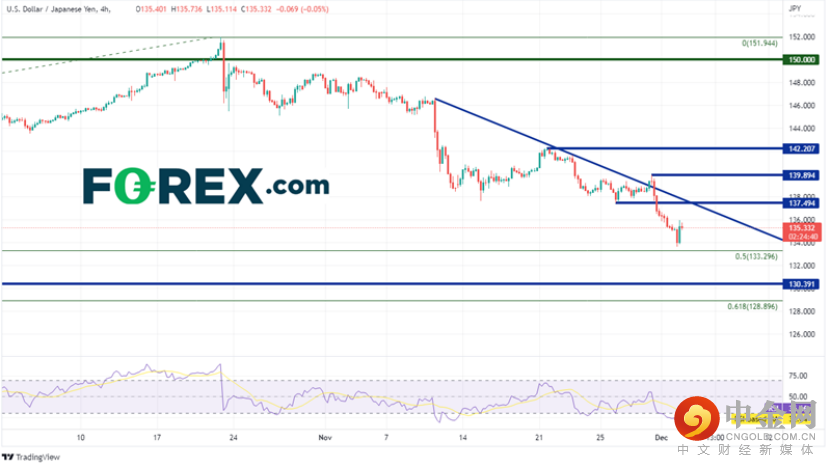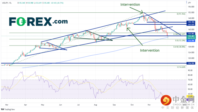 非农数据结果不仅对美元有利,它还助力美元/日元短暂跌破200日均线134.50,并在3月4日低点到10月21日高点区间的的50%回撤位获得支撑。另请注意,RSI已进入超卖区域,表明该货币对可能已准备好反弹。如果今天的K线收于当前点位(135.30)附近,它将形成T字星。此图形与超卖区域的RSI结合可能构成强势的反转信号。