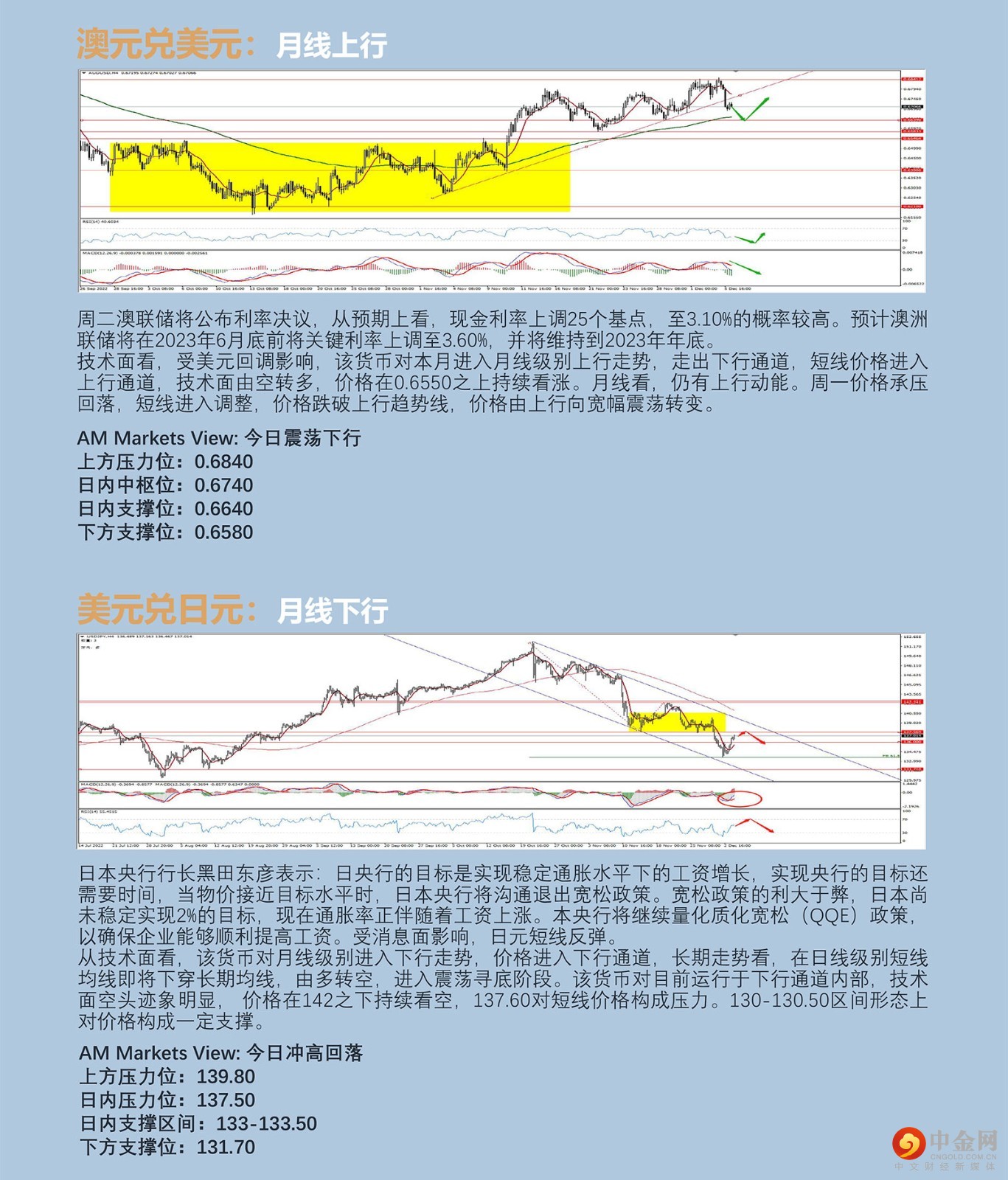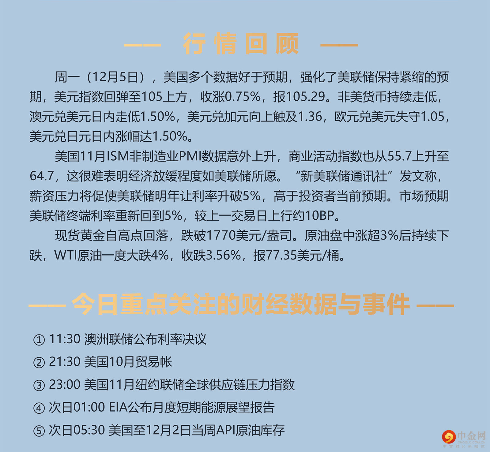 周一(12月5日),美国多个数据好于预期,强化了美联储保持紧缩的预期,美元指数回弹至105上方,收涨0.75%,报105.29。非美货币持续走低,澳元兑美元日内走低1.50%,美元兑加元向上触及1.36,欧元兑美元失守1.05,美元兑日元日内涨幅达1.50%。 美国11月ISM非制造业PMI数据意外上升,商业活动指数也从55.7上升至64.7,这很难表明经济放缓程度如美联储所愿。“新美联储通讯社”发文称,薪资压力将促使美联储明年让利率升破5%,高于投资者当前预期。市场预期美联储终端利率重新回到5%,较上一交易日上行约10BP。 现货黄金自高点回落,跌破1770美元/盎司。原油盘中涨超3%后持续下跌,WTI原油一度大跌4%,收跌3.56%,报77.35美元/桶。