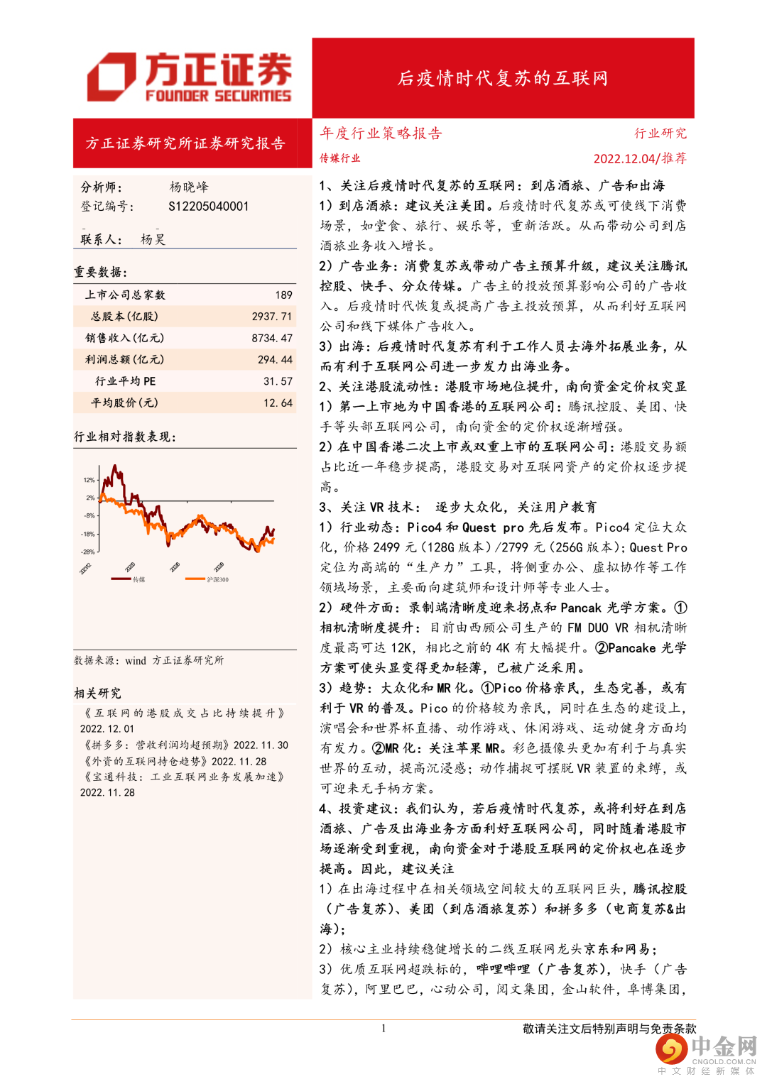 本文来自方正证券研究所于2022年12月4日发布的报告《后疫情时代复苏的互联网》,欲了解具体内容,请阅读报告原文。