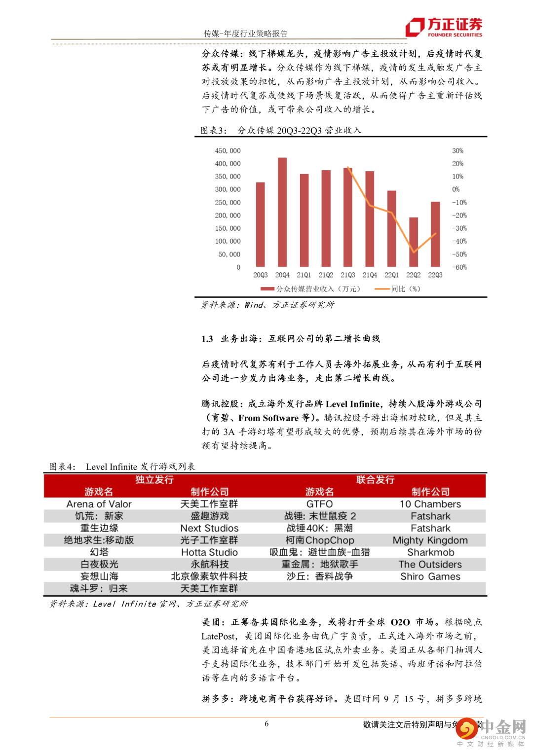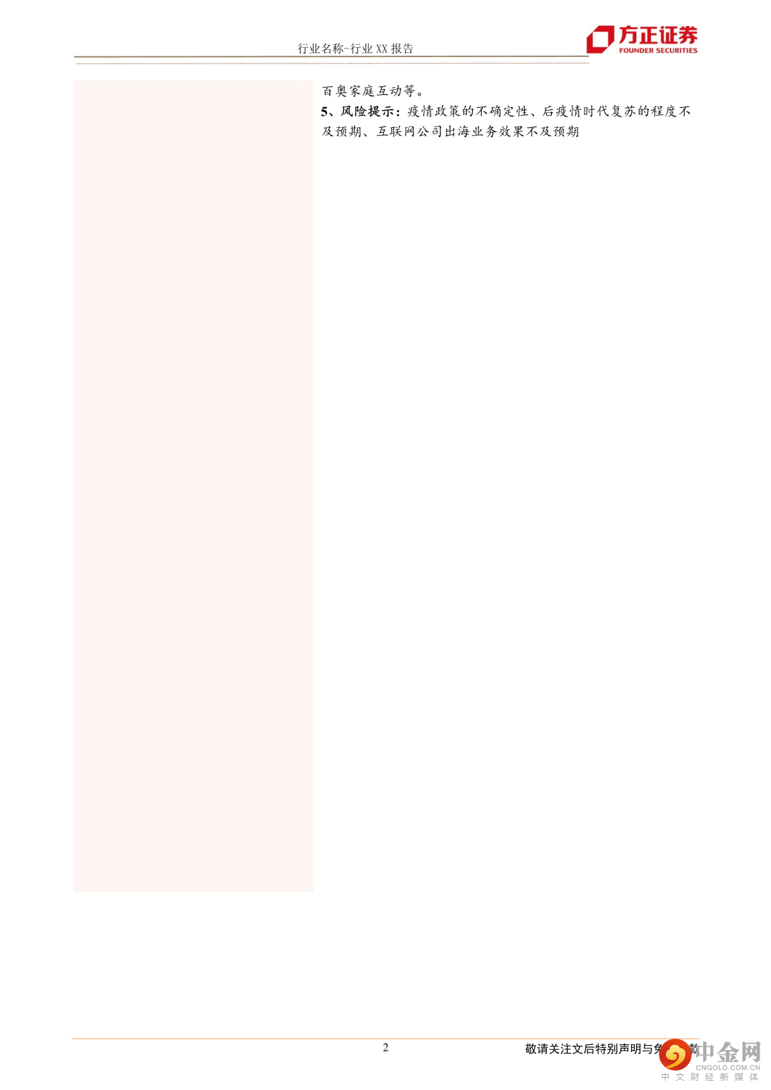 风险提示:疫情政策的不确定性、后疫情时代复苏的程度不及预期、互联网公司出海业务效果不及预期。