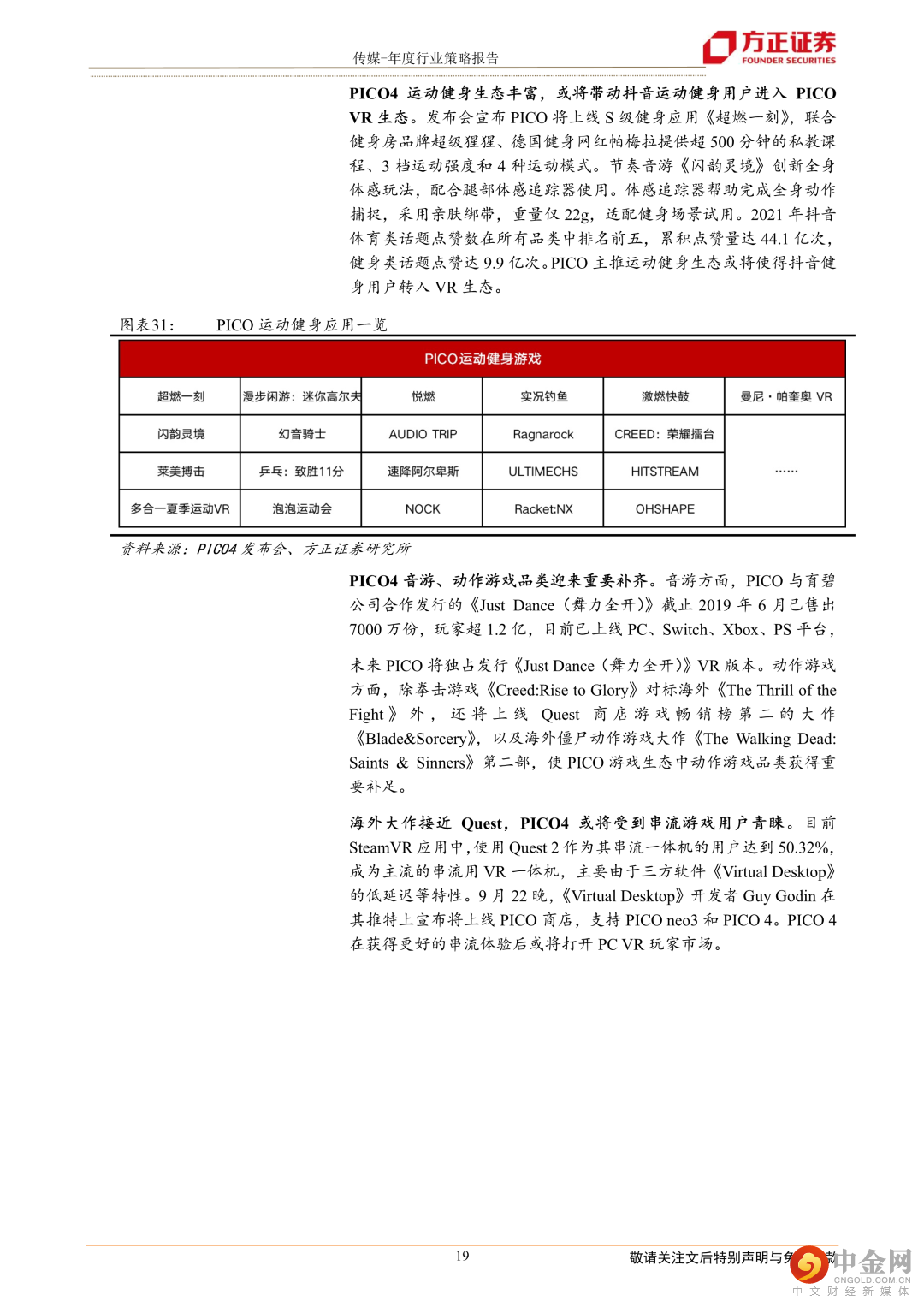 3)趋势:大众化和MR化。①Pico价格亲民,生态完善,或有利于VR的普及。在生态的建设上,演唱会和世界杯直播、动作游戏、休闲游戏、运动健身方面均有发力。②MR化:关注苹果MR。彩色摄像头更加有利于与真实世界的互动,提高沉浸感;动作捕捉可摆脱VR装置的束缚,或可迎来无手柄方案。
