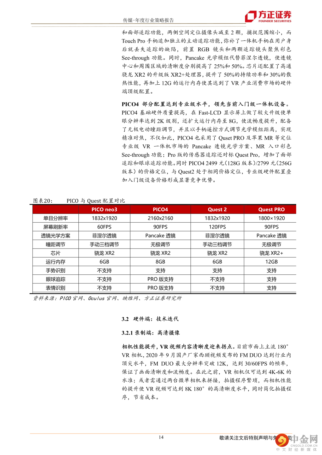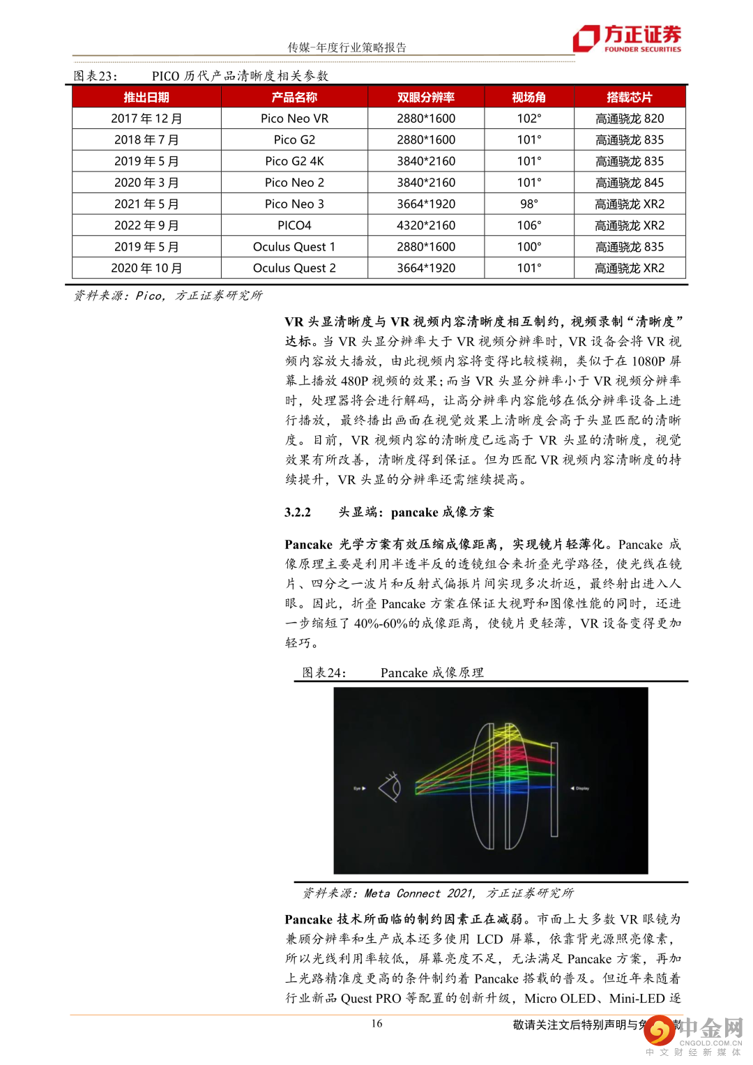2)硬件方面:录制端清晰度迎来拐点和Pancak光学方案。①相机清晰度提升:目前由西顾公司生产的FM DUO VR相机清晰度最高可达12K,相比之前的4K有大幅提升。②Pancake光学方案可使头显变得更加轻薄,已被广泛采用。