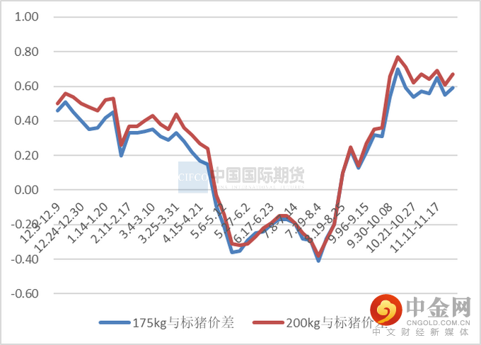 11月肥—标价差依旧为正,月内最高达到0.65(170公斤-标猪)和0.69(200公斤-标猪),较10月有所收窄。11月规模场出栏增量,散户在价格下跌影响下情绪松动大猪出栏增加。肥猪供应增多,但腌腊、灌肠需求增量不明显,导致月度肥标价差缩小。12月气温下降腌腊增多,月底由冬至,支撑大猪消费,预计肥标价差再次扩大。