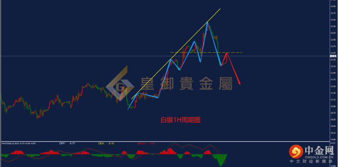 从下方的白银1小时周期图看,白银此前自20.84一线进行拉涨,走出高点逐渐上移的上涨趋势,并构建上方压力线,行情于压力线下方运行。昨日,白银再次触及上方趋势线压力后迎来回落,并成功下破前低位置,行情上行节奏被破坏。从指标上来看,MACD指标的空头动能有放量迹象,且DIFF与DEA双线成功下穿0轴,预计行情后市大概率将进行延续下跌。日内操作建议以逢高做空为主,当前可于上方关键压力位22.56一线进行入场。