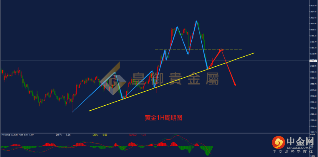 从黄金1小时周期图来看,黄金此前自1726一线进行上涨并构建下方支撑线。近日,黄金向上冲高,于昨日触及1810一线后迎来回落。当前从形态上来看,黄金再次回落至下方支撑线附近并迎来短线反弹。从指标上来看,MACD指标的空头动能有放量迹象,且DIFF与DEA双线在黄金顶背离修复过程中成功下穿0轴,预计当前行情大概率迎来反转,日内操作建议以逢高做空为主,当前可尝试于上方关键压力1783一线进行入场。