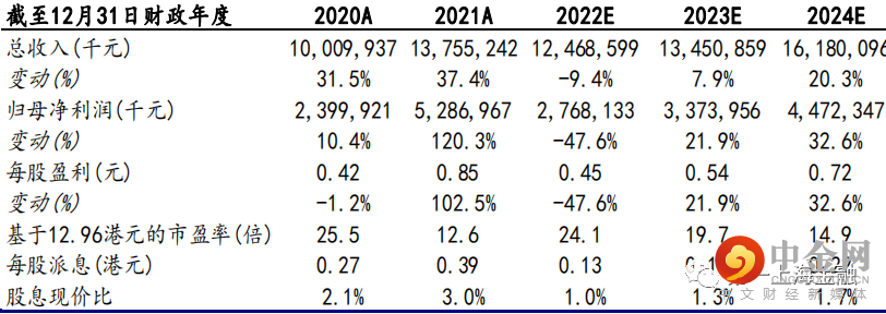 我们预测公司 2022-2024 年归母净利润分别为 28 亿港元、34 亿港元和 45 亿港元。给予公司目标价为 16.4 港元,对应 2023 年的 25 倍 PE 估值,较现价有 26.7%的上涨空间,维持买入评级。