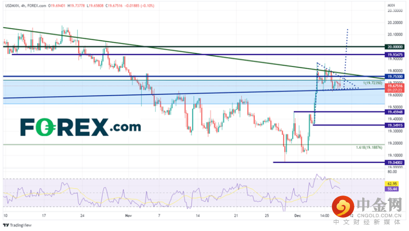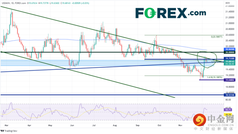 在日线图上,我们可以更清楚地看到前面提到的阻力区域是多么关键。美元/墨西哥比索自2020年4月以来一直走低(见周线图)。11月4日,该货币对终于跌破支撑区域底部19.5060附近。美元/墨西哥比索随后继续走低,直到价格短暂突破9月12日低点到9月28日高点区间的161.8%斐波那契扩展线19.1888。周五,在美国非农就业数据公布后,该货币对大幅走高,并在周一继续从低点19.1081升至近期高点19.8621。它会继续走高吗?