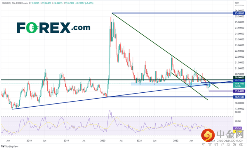 在周线图上,美元/墨西哥比索交投于关键区域。19.5060/19.7530区域是关键阻力区域,汇集了2017年7月以来的趋势线、2020年4月高点以来的下行趋势线和完全确立的阻力区(前支撑区)。