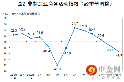 11月份,非制造业商务活动指数为46.7%,比上月下降2.0个百分点,低于临界点,非制造业景气水平有所回落。