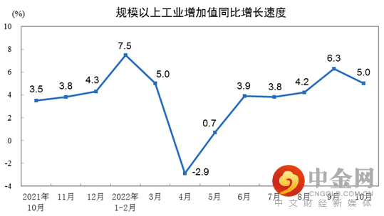 10月份,规模以上工业增加值同比实际增长5.0%(增加值增速均为扣除价格因素的实际增长率)。从环比看,10月份,规模以上工业增加值比上月增长0.33%。1—10月份,规模以上工业增加值同比增长4.0%。