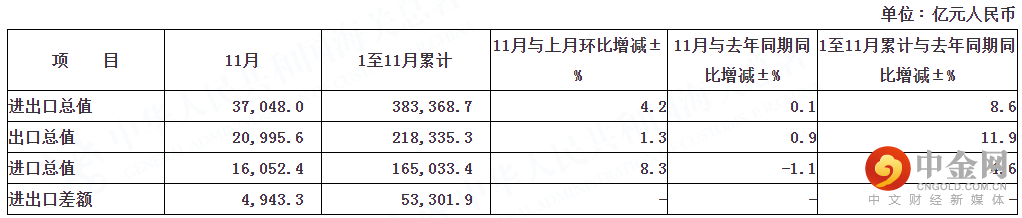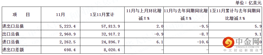 以美元计价,中国11月出口同比下降8.7%,前值下降0.3%。11月进口同比下降10.6%,前值下降0.7%。11月贸易顺差698.4亿美元。以人民币计价,中国11月出口同比增长0.9%,前值增长7.0%;11月进口同比下降1.1%,前值增长6.8%。11月贸易顺差4943.3亿元。