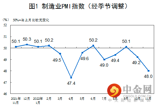 11月份,制造业采购经理指数(PMI)为48.0%,比上月下降1.2个百分点,低于临界点,制造业生产经营景气水平较上月有所下降。