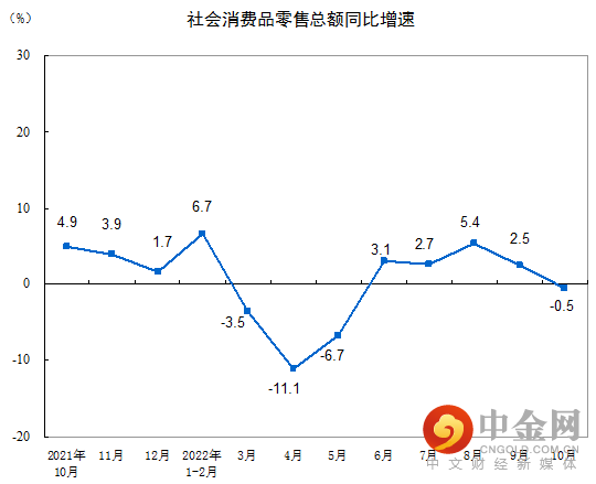 10月份,社会消费品零售总额40271亿元,同比下降0.5%。其中,除汽车以外的消费品零售额36575亿元,下降0.9%。1—10月份,社会消费品零售总额360575亿元,同比增长0.6%。其中,除汽车以外的消费品零售额323702亿元,增长0.5%。