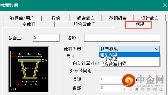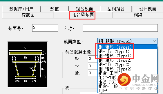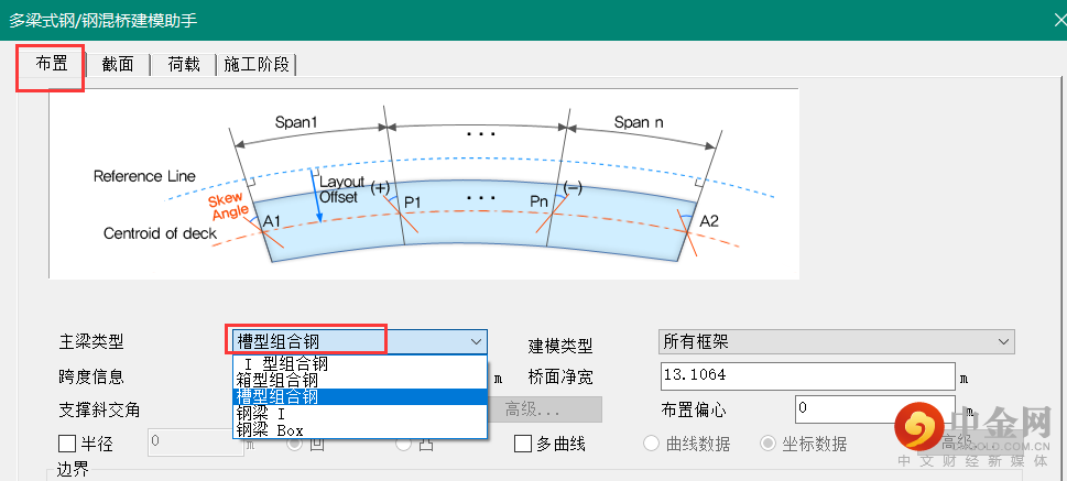 对于多梁式钢/钢混桥建模助手,支持组合梁模型中的I型组合梁、箱型组合梁、槽型组合梁(以上三种仅支持Type1型)以及钢梁中的I型钢梁、箱型钢梁(不支持单箱多室钢梁)。使用单梁式钢/钢混桥建模助手或多梁式钢/钢混桥建模助手指定截面的时候,要注意需要先在布置选项卡的主梁类型中选择与定义的截面相匹配的类型,再选择截面,否则也会出现截面定义下拉菜单中没有截面的情况。