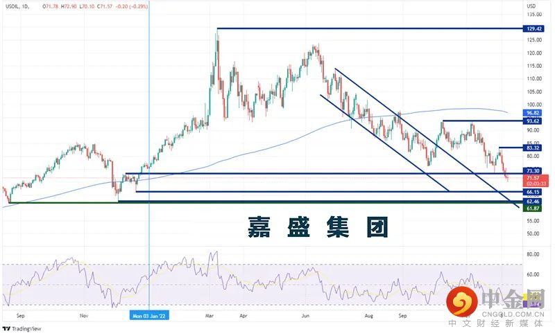 WTI原油上周下跌超过11%,并连续6天收低。周五价格跌至年初至今的新低70.10!在3月8日创下高点129.42后,有多少人会预计到今年的年内涨幅为负值?对经济衰退和需求不足的担忧导致油价在2022年下半年走低。它会继续下跌吗?第一个支撑位要等到再下跌超过5美元才会出现,即2021年12月20日下影线低点66.15。在此下方,价格可能跌至2021年12月2日的低点62.46,然后是2021年8月23日的低点61.76!但是,请注意RSI位于超卖区域的边缘,接近30.00.也许WTI可能会反弹?第一阻力位于11月28日低点73.62。在此上方,下一个阻力位是11月30日以来的高点83.32,然后是10月10日的高点93.62!