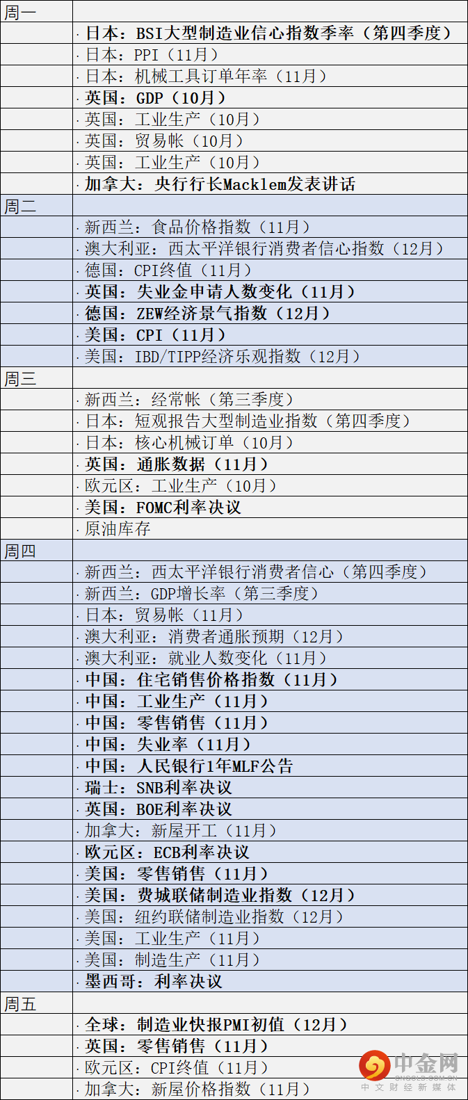 由于本周汇聚了大量央行会议(我们甚至没提瑞士央行、挪威银行或墨西哥银行),本周经济数据的冲击将退居二线。如前所述,英国将在央行会议之前发布失业金申请人数、GDP和通胀数据,并在周五报告零售销售。美国本周还将发布CPI、费城联储制造业PMI和零售销售。中国将在周四发布一系列数据。周五,全球12月PMI初值报告将出炉。本周公布的其他经济数据如下: