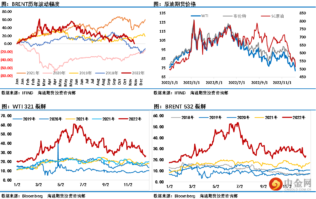 从11月上旬到现在,仅一个月SC原油已经从最高点下跌超30%,布伦特和WTI原油跌幅也有25%。这样一轮大跌过后,油价毫无疑问存在超跌修复预期,目前需求疲弱重挫了市场信心,原油市场供需格局并没有呈现明显的过剩压力,只是目前市场信心处于低位,供应端围绕俄罗斯被制裁及中国优化防控措施后需求恢复的过程都存在一定不确定性,这让投资者决策时非常谨慎。总体来看,油价企稳回暖概率在增加,不宜继续大幅看空油价。