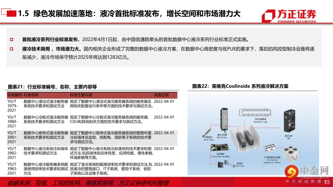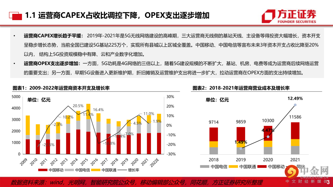 1、行业新变化:从信息化走向产业数字化 运营商CAPEX占收比调控下降,OPEX支出逐步增加,千兆光网用户加快发展,光纤光缆量价齐增,5G中后期应用爆发,产业数字化和云,驱动运营商业绩高增长; 欧美经济放缓,“内循环 ”通信公司受益,融合通信深入推进,“通信+汽车”带来增量空间、“通信+军工”迎景气周期、“通信+储能”长期动力十足,绿色发展加速落地:液冷成为制冷方案新趋势。
