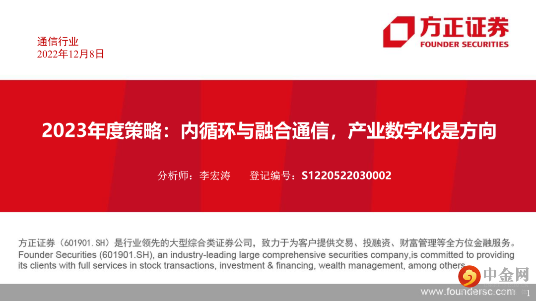 本文来自方正证券研究所于2022年12月8日发布的报告《2023年度策略:内循环与融合通信,产业数字化是方向》,欲了解具体内容,请阅读报告原文。