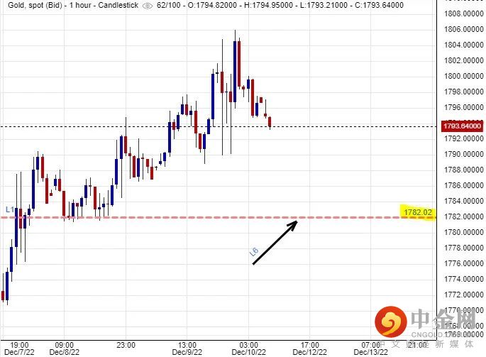 正当市场人士都在憧憬美国通胀状况将会进一步降温之际,美国上星期五发布的11月份核心生产物价指数结果却较预期及上次为好,这前瞻性通胀数据结果可以说是对通胀敏感的投资者再一次响起警号。因为虽然美国11月份整体生产物价在能源价格下滑的时候出现轻微降温,但撇除食物及能源价格的核心生产物价指数却又比预期及上次为高,反映出通胀降温程度应该是远不如理想,联储局就算在这星期的议息会议上只加息半厘,也但不代表肯定地已经进入放慢加息步伐 蓝图上。在买入黄金的风险承受意欲不会大幅度上升的情况下,金价短期间应该未能够轻易地在$1,810美元的上方站稳阵脚。