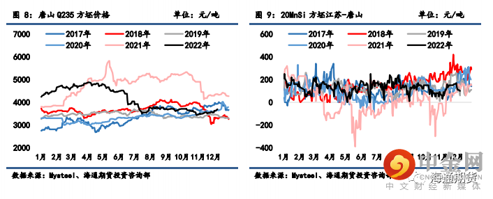 上周钢材期货盘面价格延续偏强格局,现货价格同样反弹走强。上周螺纹钢 2301 合约上涨 4.73%至 3945 元/吨,热轧卷板 2301 合约上涨 4.03%至 4051 元/吨。上周上海螺纹上涨 60 元/吨至 3850 元/吨,杭州螺纹上涨 80 元/吨至 3910 元/吨,广州螺纹上涨 90 元/吨至 4240 元/吨附近,北京螺纹上涨 70 元/吨至 3790 元/吨。螺纹华东华南过磅价差降至-390 元/吨附近,华南北方过磅价差从 360 回升至 360 元/吨附近。上海热卷上涨 130 元/吨至 4070 元/吨,广州热卷上涨 140 元/吨至 4120 元/吨,华东卷螺价差从热卷价格高出螺纹 150 元/吨扩大至 220 元/吨。上周各地区钢坯现货价格表现坚挺,唐山方坯 Q235 上涨 140 元/吨至 3690 元/吨,唐山 20MnSi上涨 140 元/吨至 3790 元/吨,江苏 20MnSi 上涨 70 元/吨至 3890 元/吨,江苏和唐山间价差降至 100元/吨。
