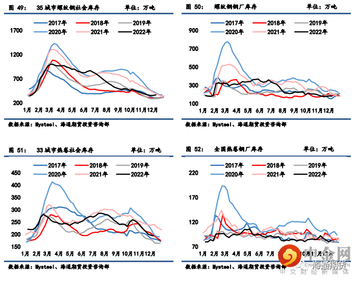 库存:螺纹钢和热卷库存结构表现为螺纹钢累社库、降厂库,热卷社库降、厂库增,螺纹钢总库存已处同期平均水平附近,热卷总库存则偏低。上周钢材供给端整体呈缓慢恢复态势,钢企盈利率微降重回 22.51%的极低水平,钢企普亏格局延续,且幅度有所加剧,也限制了钢企生产的积极性和复产力度;需求仍在同期低位波动,螺纹钢供需增速差小幅回落,但仍处于供应过剩格局,叠加螺纹钢已进入累库阶段,整体螺纹钢基本面边际压力有所加强。近期疫情防控措施优化和宏观稳增长信号仍在释放,强预期仍处于走强过程中,但短期市场消费行为仍受到一定限制,基本面现实压力仍然延续,需警惕钢价在强预期走强后现实端的冲击影响,钢价近弱远强格局仍有望延续。