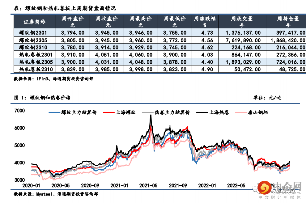 上周钢材期货盘面价格延续偏强格局,现货价格同样反弹走强。上周螺纹钢 2301 合约上涨 4.73%至 3945 元/吨,热轧卷板 2301 合约上涨4.03%至 4051 元/吨。螺纹钢近月合约表现整体略弱于远月,5-10月间价差小幅走弱;螺纹钢和热卷现货均弱于期货,主力基差继续走弱;期货方面热卷主力合约表现略强于螺纹,卷螺价差小幅回升;铁矿石表现强于成材,螺矿比价继续下降。