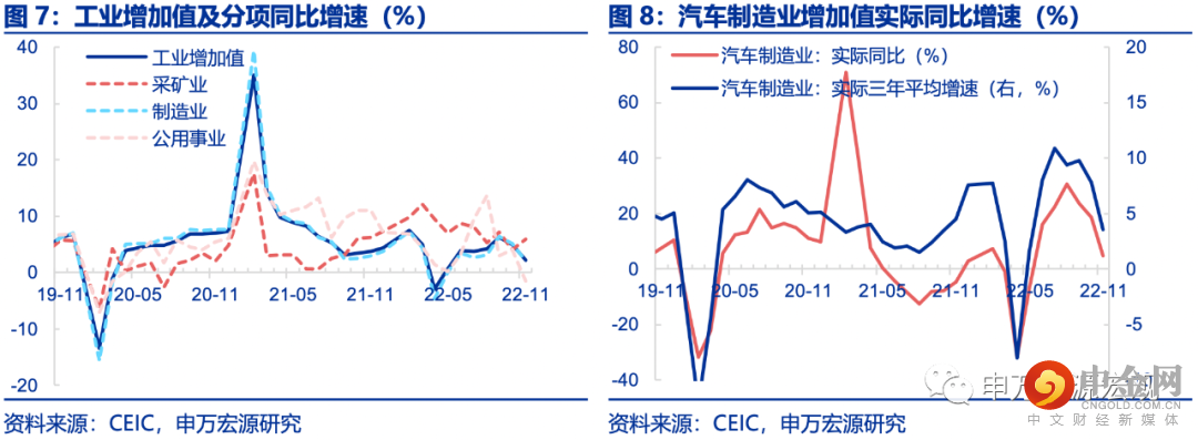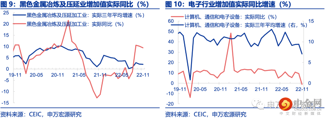 11月工业增加值实际同比2.2%,较上月下行2.8pct。分结构来看,采矿业(+1.9pct至5.9%)小幅回暖,煤炭产量(+1.9pct至3.1%)高基数下转为改善,大宗保供持续稳定产业链;气温偏暖,公用事业(-5.5pct至-1.5%)明显走弱;制造业(-3.2pct至2.0%)进一步走弱。基建投资高光延续难有效对冲地产下行,但与地产基建直接相关的黑色金属(三年平均增速,下口径同,-0.1pct至2.1%),非金属矿物(-1.0pct至1.7%)、有色金属(+0.2pct至4.0%)下行幅度则相对较小,或再度出现补库存。出口产业链出现分化,郑州、广深等电子产业链较为集中地区受疫情冲击明显,计算机、通信和其他电子设备制造(-2.4pct至7.1%)明显下行。而中游生产如通用设备(-1.3pct至3.9%)、专用设备(-0.5pct至5.5%)受疫情防控措施影响较小。消费恢复乏力,特别是新能源车补贴退坡预期下前期的集中需求释放和接近年底的汽车销量大幅下滑,令汽车生产(-4.3pct至3.6%)大幅降温。