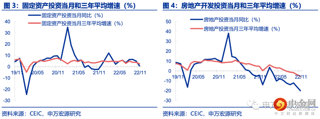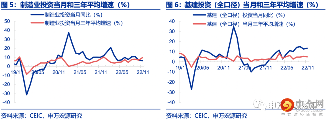 地产投资加速回落加之广义基建改善放缓拖累固定投资低于预期,制造业投资则发挥更突出的稳增长效果。11月固定资产投资累计同比5.3%,低于我们预期(5.6%),测算单月同比大幅回落4.2个百分点至0.8%。低于预期的主要是房地产开发、广义基建投资和除三大投资外其他投资。房地产开发投资单月同比跌幅再次扩大3.9pct至-19.9%。保交楼政策与“三支箭”落地虽然加快疏通房企融资,但地产需求持续偏弱的背景下房企短期加快开发的积极性不高。广义基建投资累计同比10.8%低于我们预期(11.2%),项目约束逐渐开始显现,此外包含新基建、数字基建等政策鼓励领域在内的除三大投资外的其他投资受疫情影响大幅走弱,制造业投资在出口大幅回落的背景下单月同比仅小幅回落0.7pct至6.2%,设备更新低息贷款与设备购置税前加计扣除等政策仍阶段性支撑制造业投资。