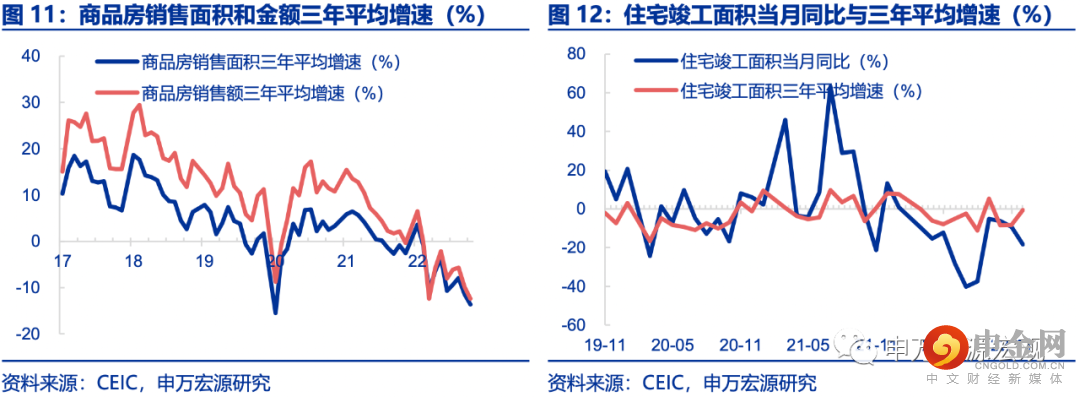 11月商品房销售面积、金额当月同比跌幅分别扩大10.0、8.5个百分点至-33.3%、-32.2%,与11月居民中长贷的清淡表现相一致。尽管因城施策刺激地产需求的政策持续加码,但从工业化、城镇化布局失衡的角度来看,这些城市恰恰是土地供给充裕、人口有所流出的地区,在人口单向流动、先进制造业布局过度集中于东南沿海地区、人地关系失衡的结构性问题尚未解决之前,短期因城施策刺激的效果注定将比较有限。地产销售连续疲弱亦压制开发商拿地开工的积极性,11月新开工面积单月同比跌幅显著加深15.7pct至-50.8%,虽然部分受到基数走高的影响,但三年平均增速也再降2.6pct至-26.0%。而住宅竣工当月同比下滑9.1pct至-18.3%,仍受上半年地产投资持续走弱的滞后影响。