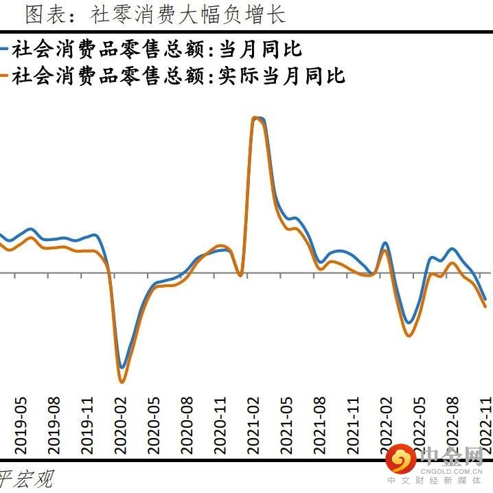 零售低于预期,防控措施优化前多地一度升级令限额以下商品和餐饮零售偏弱,但除此之外,也应注意到2023年新能源汽车补贴退出的预期令前期汽车需求集中释放,时近年底连续明显降温;此外地产竣工偏弱持续拖累可选消费、电子产品供给冲击也是重要原因。11月社会消费品零售同比-5.9%,较上月下行5.4个百分点,低于我们前期偏低的预测(-4.3%),主要源于四大因素:一是11月疫情防控升级导致餐饮收入和限额以下商品零售及必需品偏弱。二是新能源车2023年补贴退出的预期下,居民已在此前数月集中释放了购车需求,当前接近年底汽车连续第二个月快速下滑;三是地产竣工偏弱对后地产周期链条可选商品的拖累,四是多个电子产品主产地防控措施升级导致生产的暂时性冲击。