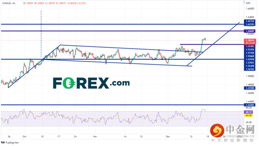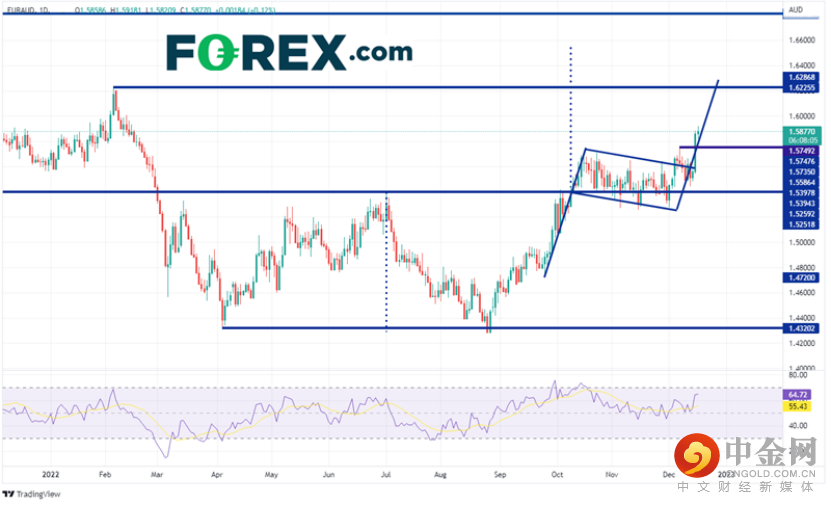 由于欧洲央行的鹰派立场和澳洲联储“不那么鹰派”的言论,欧元/澳元走高。 在日线图上,欧元/澳元在2月4日创下了年内高点1.6226。 该货币对随后大幅走低,并在4月5日触及1.4320。 在整个夏季反弹至1.5398之后,该货币对再次下跌,并在8月25日测试了之前的低点,建立了潜在的双底。 欧元/澳元再次反弹,并于10月10日在1.5397附近创下4月5日以来的高点。 这次突破在1.6550附近设定了双底的目标位。 突破后,欧元/澳元以旗形盘整,等待下一个促成涨势的催化剂。 在周四表现强势的欧洲央行似乎就是一例。