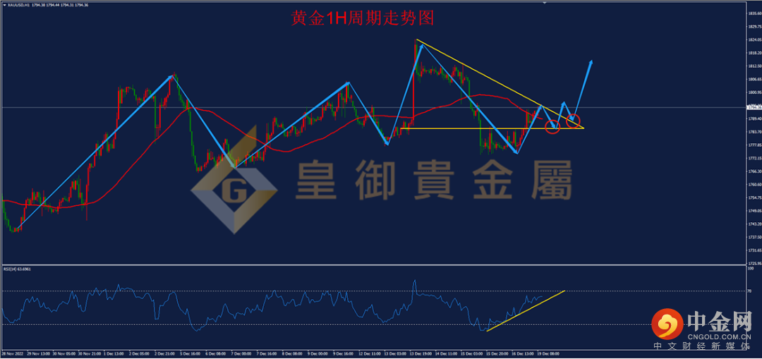 从1H周期走势结构看,白银上周快速下探周线级别重要支撑22.50-22.70一线后,快速拉升,并一举站上23.00一线整数关口,4小时级别出现Pinbar形态,多头反攻动能强劲,预计未来有望进一步展开上涨空间,从目前的1小时级别RSI来看,指标已经向上突破下行趋势线,1小时级别MACD形成底背离信号,今日如果回踩下方重要支撑,可轻仓尝试多单。