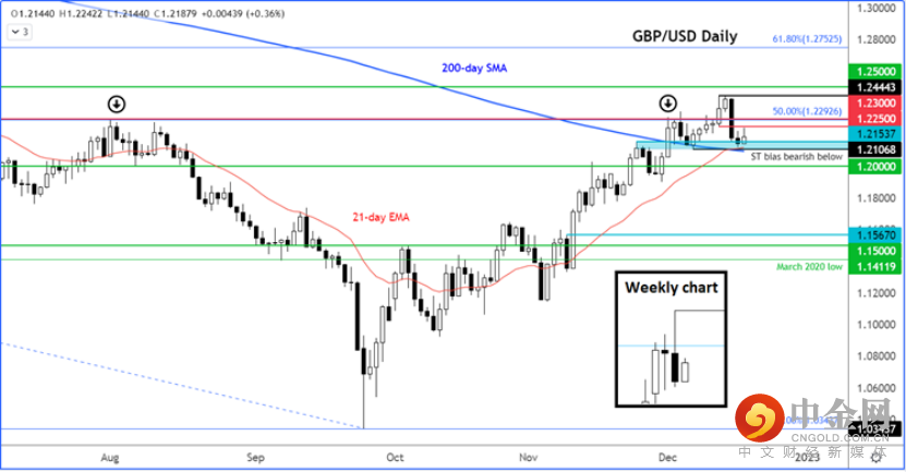 继上周央行的密集会议之后,英镑/美元本周下跌了约1%,不过从本周高点计算,跌幅更为明显——下跌2.4%或300点。由此产生了看跌的倒锤周K(见日线图上的插图)。鉴于这种潜在的反转发生在2021年高点至今的整个下跌区间的 50% 回撤位附近,它可能在未来几周发展为重大跌势。