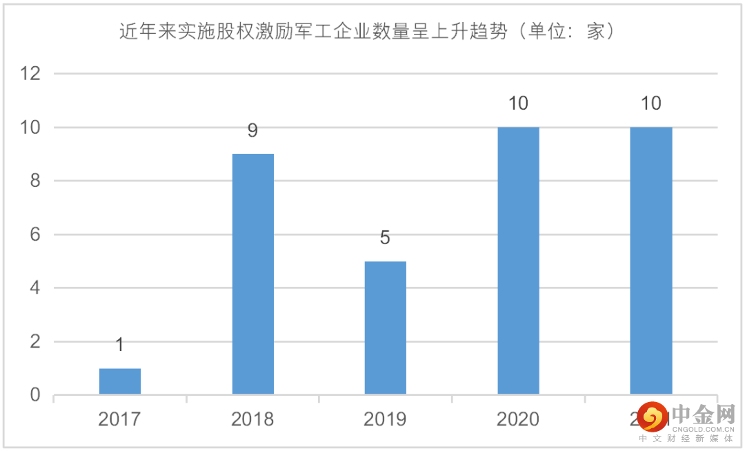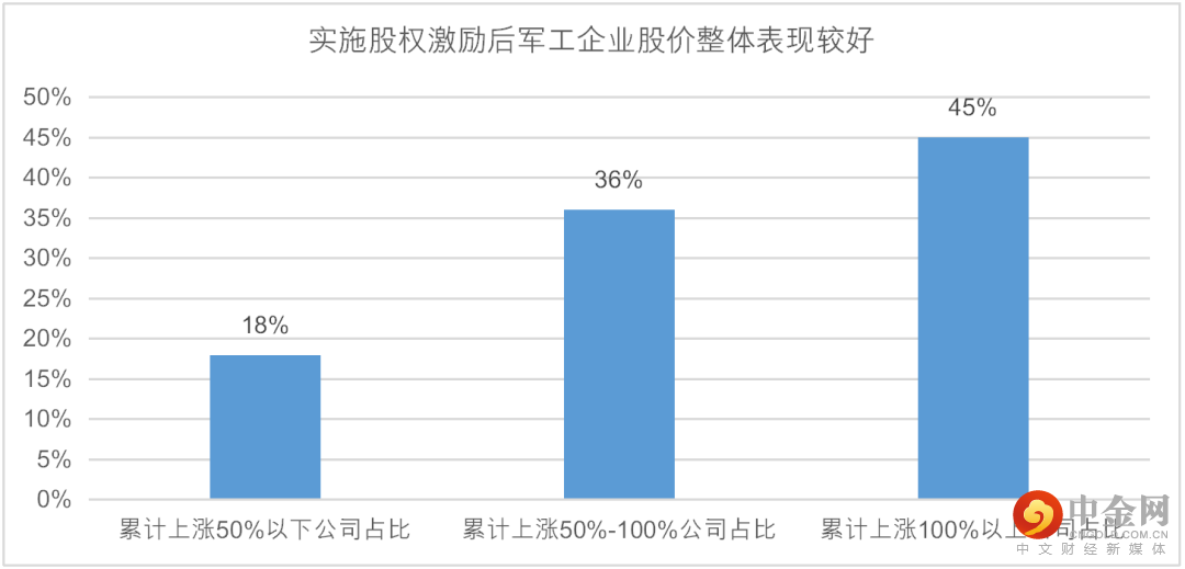 从军工国企改革的收效来看,过去五年开展股权激励的军工企业数量整体呈现上升趋势,2020年和2021年达到了历史新高的每年10家。同时,在过去五年间实施股权激励的近30家军工企业中,在公告激励草案后的第三年,有近半数公司股价实现了翻倍,军工企业较好地受益于国企改革红利。