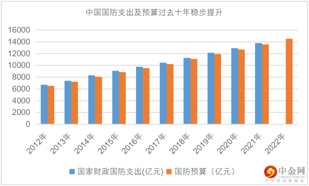 党的二十大报告强调“国家安全是民族复兴的根基,社会稳定是国家强盛的前提”,凸显国家安全和社会稳定在实现中华民族伟大复兴进程中的重要地位。而回顾过去十年,同样可以看到国家在国防上的投入逐年提升。2012-2022年,中国国防支出和预算一直处于稳步提升的态势,2022年国防预算增速更是重回7%以上增速,达到7.1%。