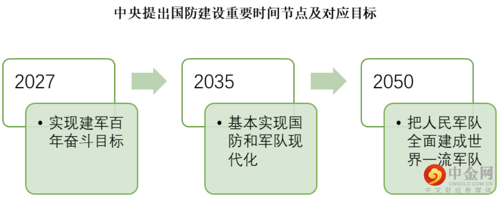 虽然我国国防预算和支出逐年增加,但是和美国等军事强国相比,我国在国防支出总量上仍处于较低水平。为进一步加强国防建设,我国提出了长期规划,在《中共中央关于制定国民经济和社会发展第十四个五年规划和二〇三五年远景目标的建议》中,建议要“加快国防和军队现代化,实现富国和强军相统一”、“确保二〇二七年实现建军百年奋斗目标”。