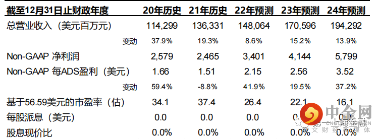 我们预计公司 2021-2024 年收入 CAGR 12.5%,Non-GAAP 净利润 CAGR 33.0%。根据 DCF 法,取 WACC=14%,长期增长率为 2%,获得目标价 80.00 美元/312.01 港币,较当前价格有 41.37%/39.17%的提升空间,维持买入评级。