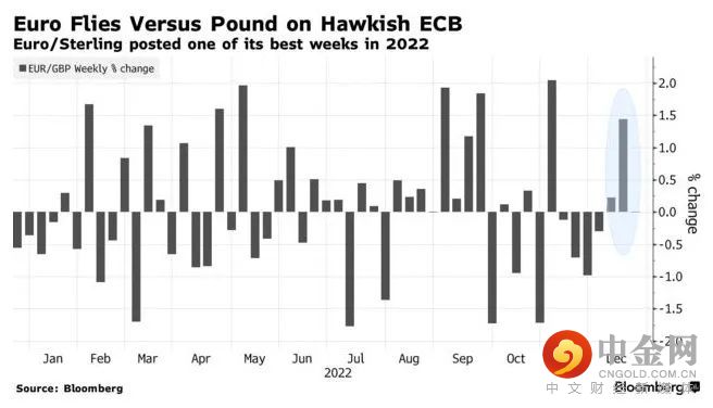 12月,英国央行和欧洲央行都将利率上调了50个基点,然而前者已经有两名投票成员呼吁暂停加息周期,而后者在做出决定之后,众多政策制定者一致表示,利率将不得不上调至超出市场预期的水平。这促使欧元兑英镑上周上涨1.4%,创下一个月来的新高。