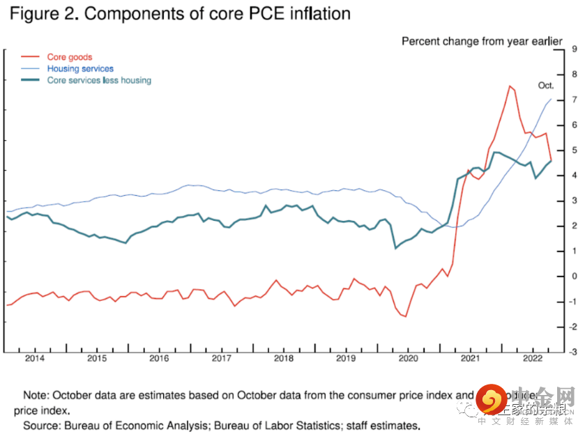 第二幅图中,红线是核心商品通胀率,蓝线是房屋租金通胀率,而暗绿线则是除房租之外的核心服务通胀率。
