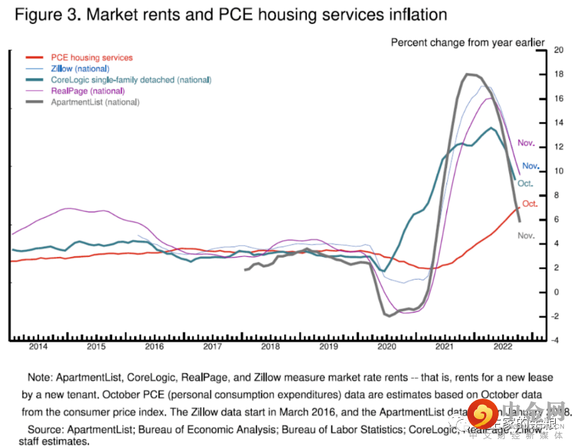 因为美联储提高利率对于居民房屋抵押贷款影响深远,而抵押贷款又直接与美国房价相关。鲍威尔这段话的意思,就是夸耀美联储过去几次加息,让美国的房地产上涨趋势掉头,房租通胀率也在迅速下降,所以,美国的住房服务价格很快也会在明年明显下降。