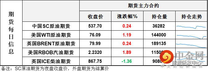 【1】WTI主力原油期货收涨0.9美元,涨幅1.19%,报76.09美元/桶;布伦特主力原油期货收涨0.19美元,涨幅0.24%,报79.99美元/桶;INE原油期货收涨0.24%,报537.7元。