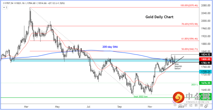 在撰写本文时,黄金交投于关键阻力位1800美元区域上方。如果每日收盘价保持在该区域上方,那么您将不得不质疑“多头陷阱”论点。如果在未来一两天内毅然回落至该点位下方,将确认看跌反转——特别是今天早些时候的低点1783美元如果被突破的话。让我们拭目以待,看看黄金在这里会怎么走,而不是急于冒进。