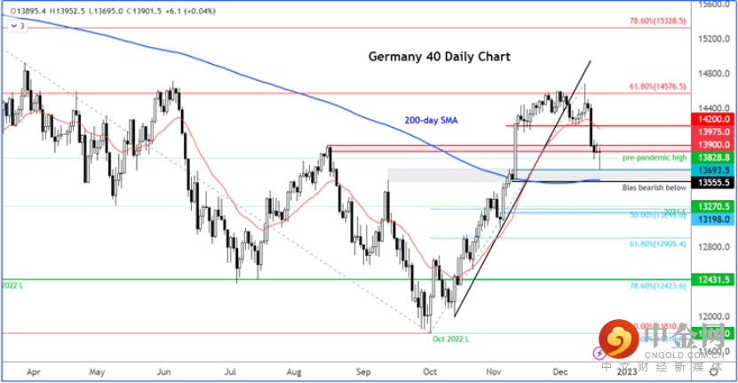 在撰写本文时,DAX指数正在测试先前的支撑/阻力区域13900-14000点。如果空头想要控制一下势头,他们将不得不在这里捍卫自己的阵地,否则我们可能会看到向着跌势起点移动的更大幅度修复。