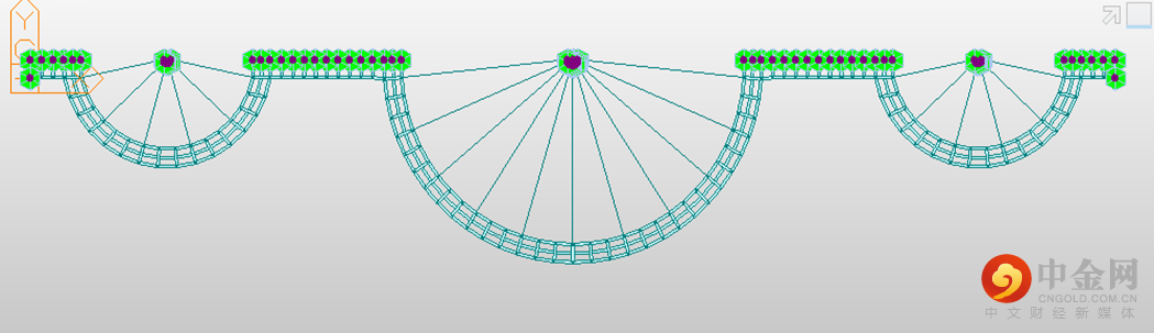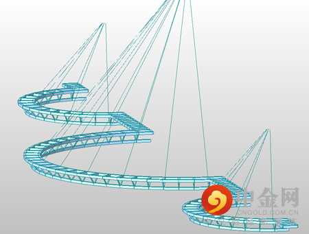 根据设计资料与设计要求,从桥梁的施工工艺,安全性,经济性,适用性,造型美观等五个方面考虑,最终选定采用弧形斜拉桥。该桥三个U形吊廊采用拉索连接岩壁与桥面。 该桥力学分析的重点与难点在于材料截面的选择及索力的调节。在本桥的力学分析中,我们团队以U形桥面的变形控制为重要目标。在规范的要求下,必须保证桥梁的位移在2公分以内。