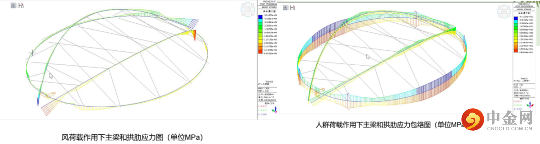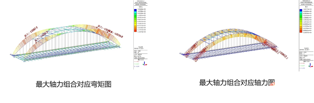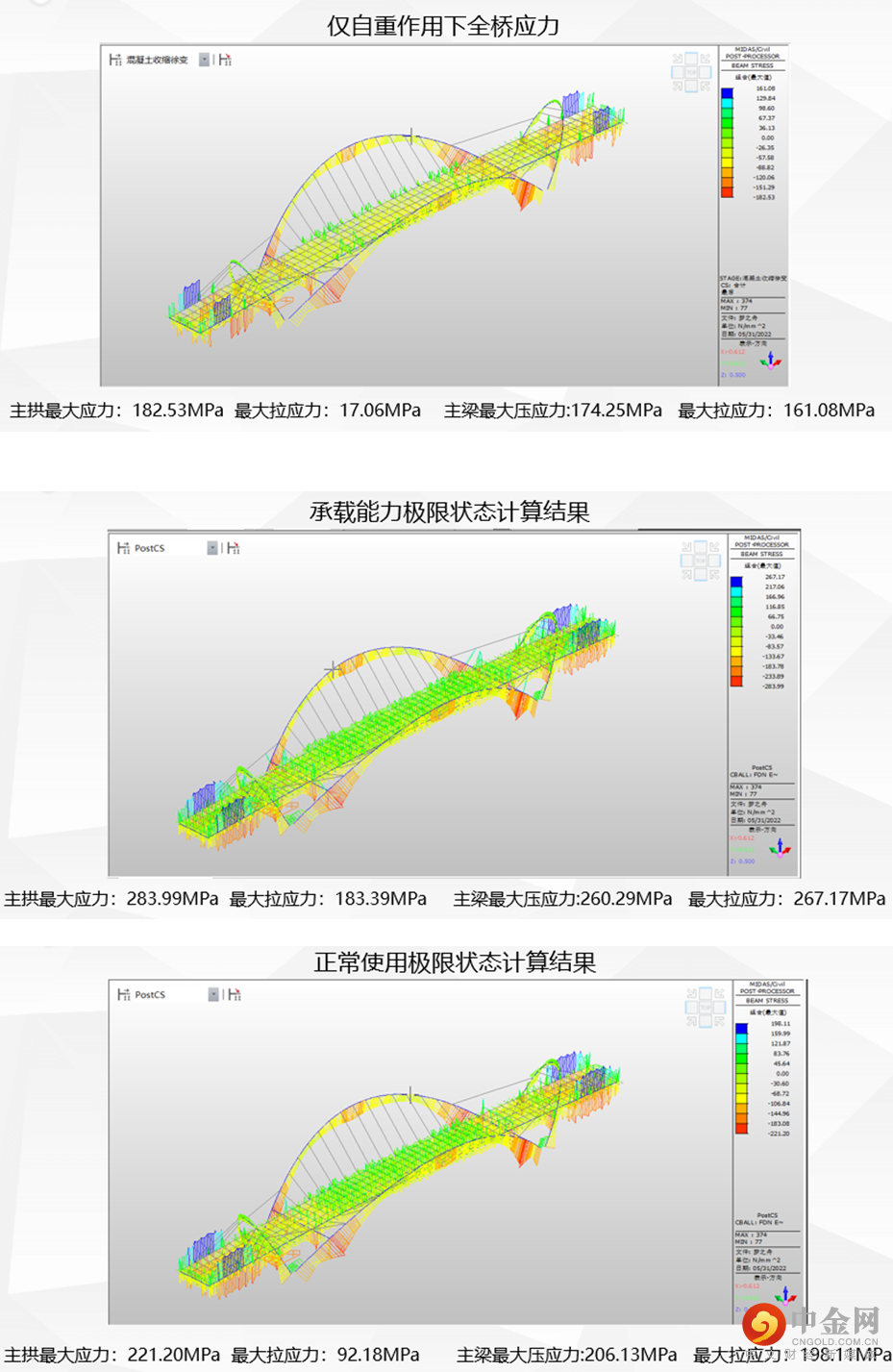 在承载能力极限状态下,主梁最大应力为159.4Mpa,拱肋最大应力为120Mpa,均满足规范的要求。