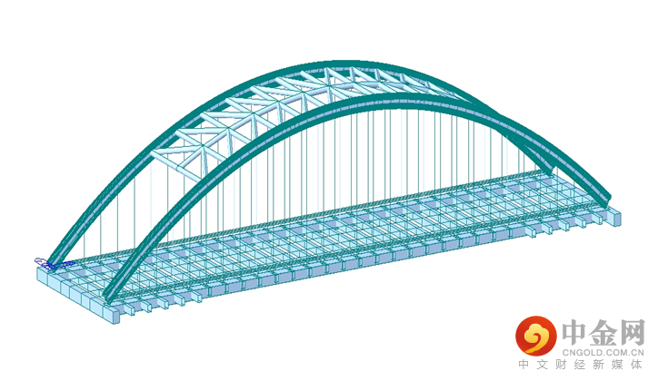 钢材:拱肋及主梁受力构件采用Q345、厚度大于40mm的钢板、吊索采用钢绞线整体挤压吊索系统、 支座在两端采用盆式橡胶支座。